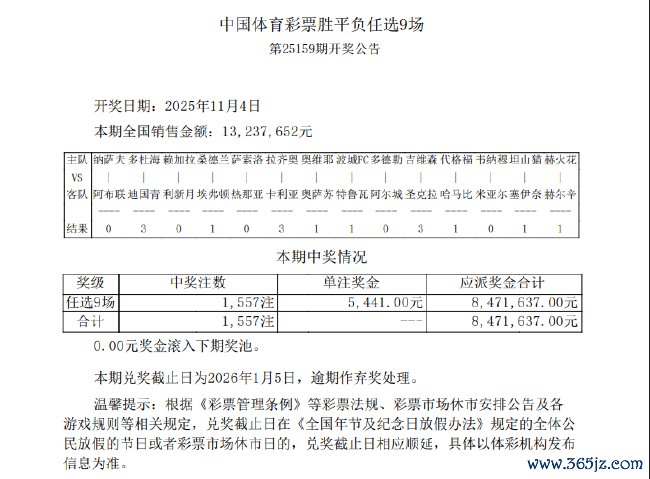 北京本事11月4日,赢输彩第25159期任九开奖效力揭晓。本期任九开出1557注,单注奖金5441元。本期任九投注总和为13,237,652元。